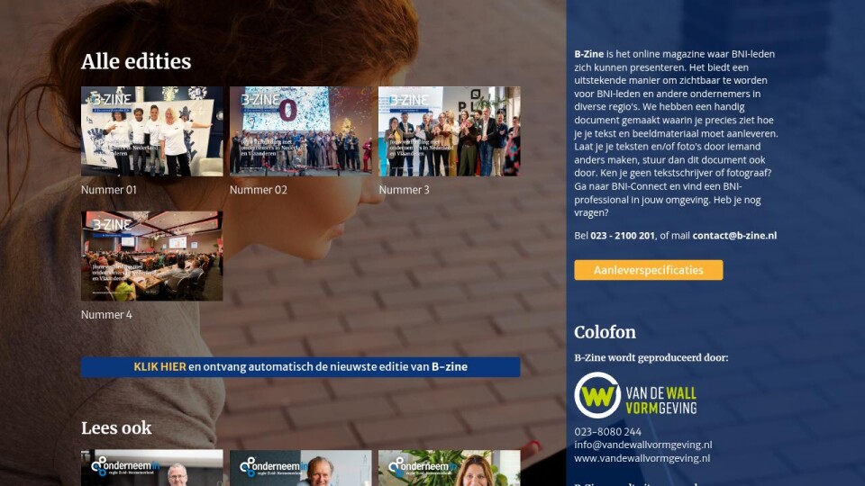 B-Zine is het online magazine waar BNI-leden zich kunnen presenteren. Het biedt een uitstekende manier om zichtbaar te worden voor BNI-leden en andere ondernemers in diverse regio's. We hebben een handig document gemaakt waarin je precies ziet hoe je je tekst en beeldmateriaal moet aanleveren. Laat je je teksten en/of foto's door iemand anders maken, stuur dan dit document ook door. Ken je geen tekstschrijver of fotograaf? Ga naar BNI-Connect en vind een BNI-professional in jouw omgeving. Heb je nog vragen?